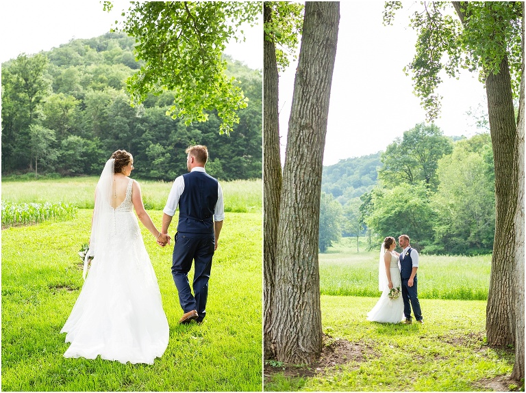 Happy First Year Anniversary to Lauren + Zeb! On June 16th, 2018, Lauren + Zeb were married! I met these two the year before for their engagement session on Zeb’s family ranch in Alma. It is such a beautiful piece of country tucked between the hills surrounding the Mississippi River. It is the same spot where they were holding their wedding, so I knew how beautiful their surroundings would be. When I initially talked to Lauren on the phone she described a mid-summer ceremony beneath the cottonwood trees when the sun shining through them. With her vision, the land a and a lot of hard work, these two and their families planned a beautiful wedding. You had no idea from their demeanor, that the torrential rain the day before had flooded the barn and the land where the wedding would be held. And it was pretty hot out out for mid June. No matter, they went with it and it all worked out pretty perfectly 🙂