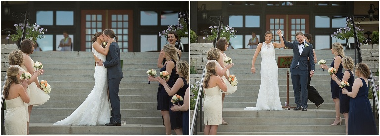 Mary and Kelsey reconnected after college (where they were on the same basketball team) and soon made their home together in Madison. The couple was married in Mary’s hometown with a wedding party full of their sisters, nieces and nephews. Mary’s gown was covered in lace with an open back and high halter neckline. Kelsey wore a fitted, dark blue tux that matched the bridesmaids’ blue and cream dresses. Bouquets of white and peach roses brought in the summer hues of sunshine. After a ceremony on the grand outdoor staircase, guests enjoyed cocktails on the deck while the couple took photos with their dog, Russell. The ballroom dinner was elegant and regal – and full of laughter as friends and family toasted the newlyweds. The evening ended with sugary sweet cake and an epic dance party.